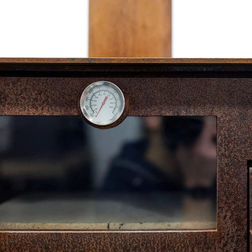 The fireplace has a closed back wall with steel plate and heat resistant concrete wall. Te chimney is equipped with a 20 cm plate on top, which prevents rain from entering the fireplace. There are also bolts on the legs, which prevent rust marks to be formed on the terrace after the fireplace has rusted. The handle is located on the right side of the door and allows the door to be left open - which is perfect during the start-up of the fireplace.